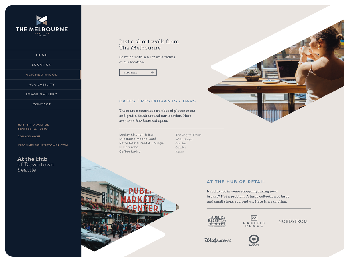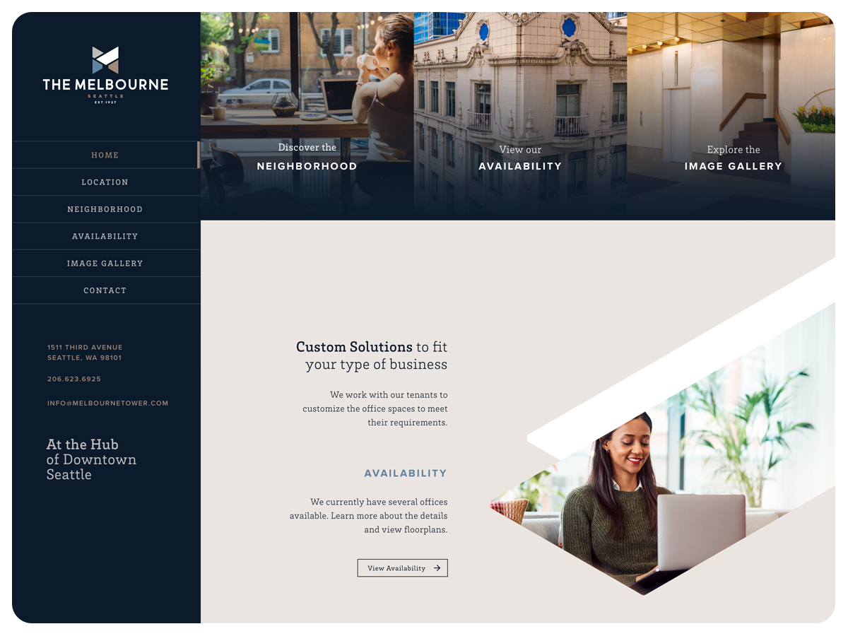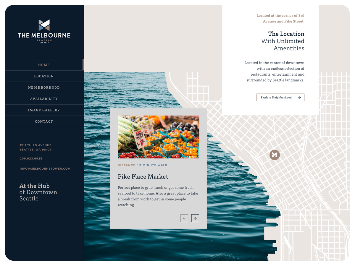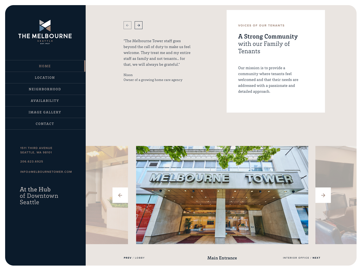 The new digital presence elevates Melbourne Tower’s identity by showcasing its central downtown location, using refined visuals and intuitive navigation to reflect life at the crossroads of Seattle.