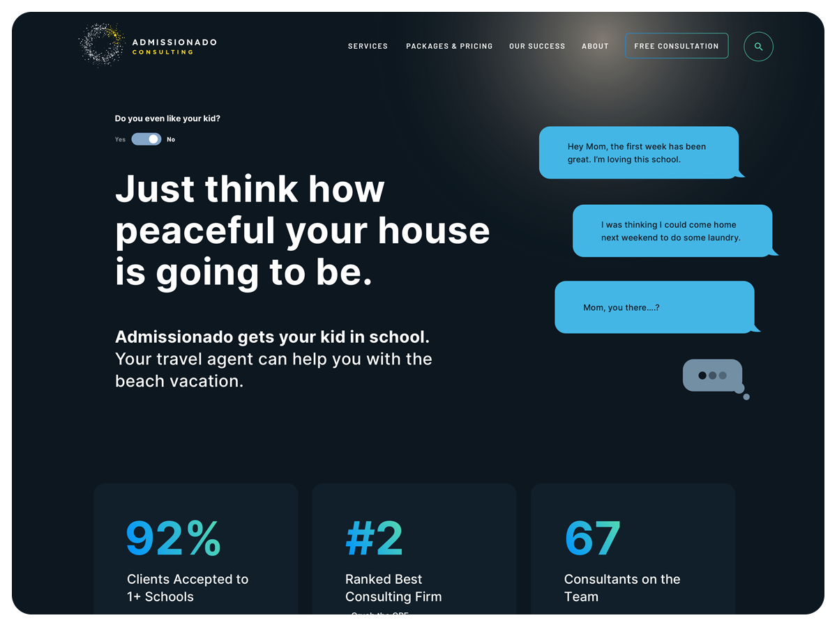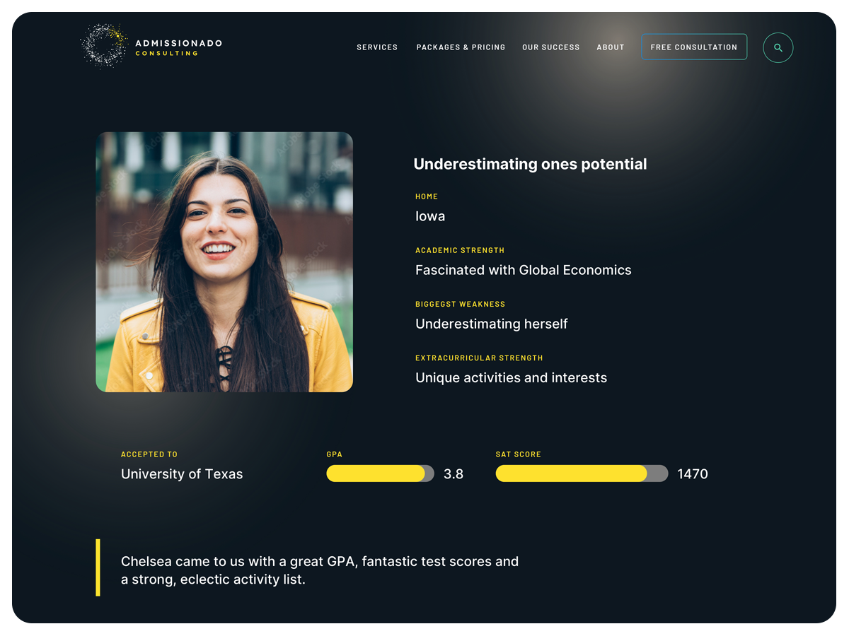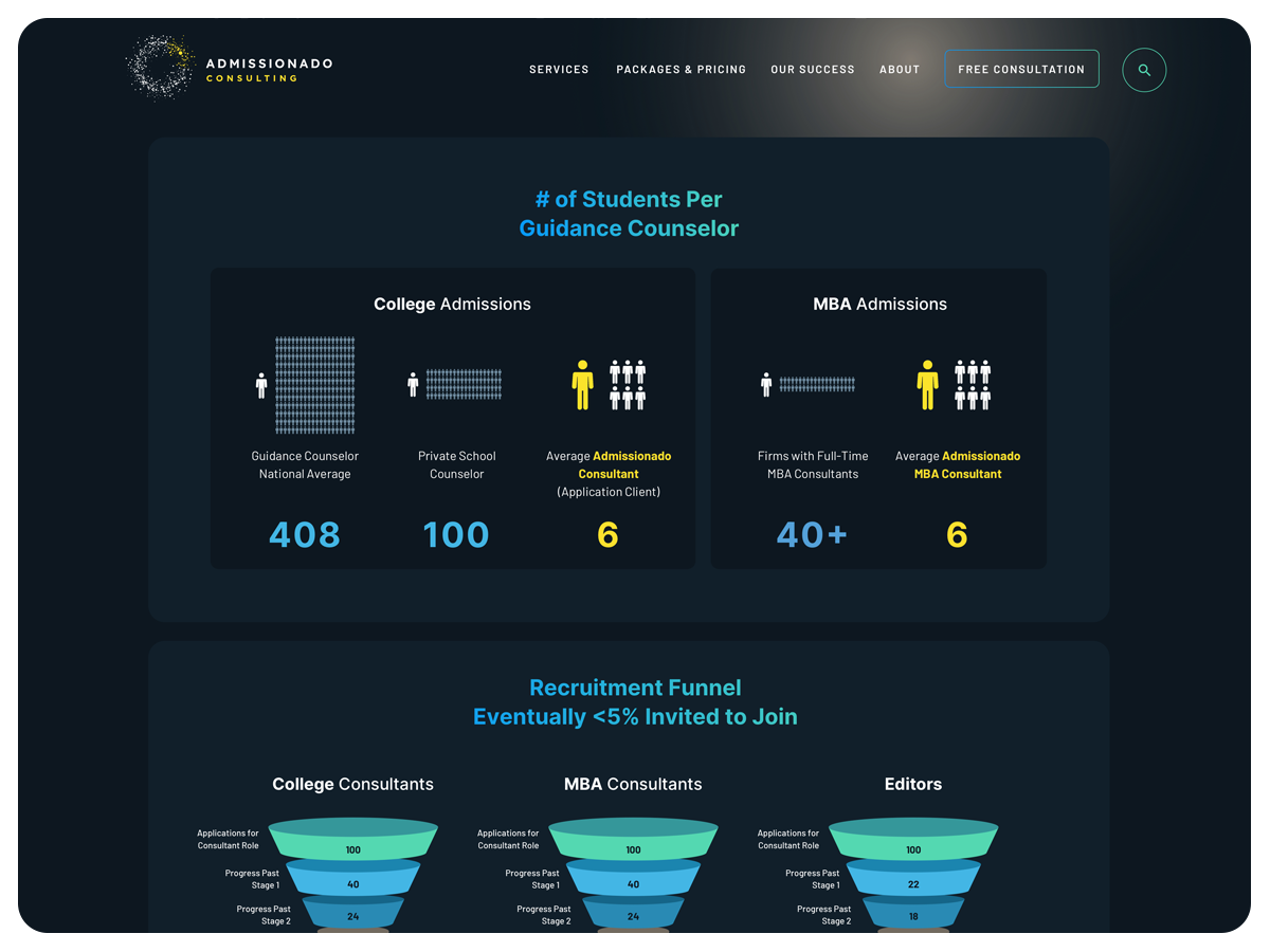 The Admissionado website was redesigned to bring clarity, confidence, and personality to one of life’s most stressful decisions. Through a refreshed brand system and an intuitive digital experience, the site positions Admissionado as both an expert guide and a trusted partner, helping ambitious students navigate the admissions process with confidence.