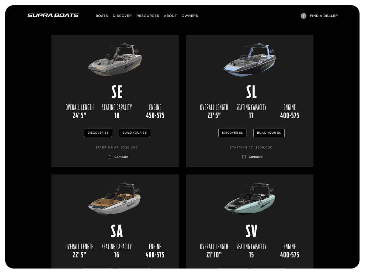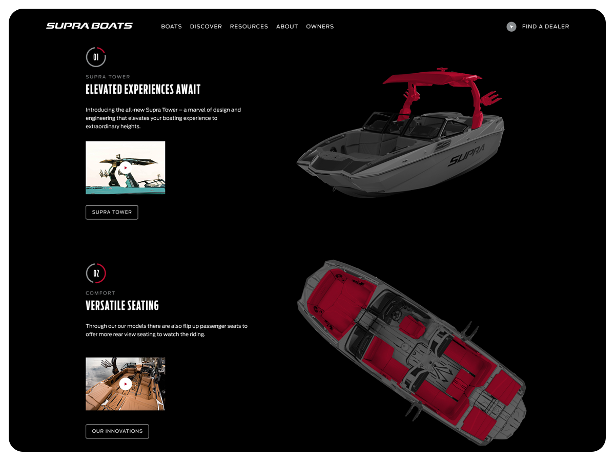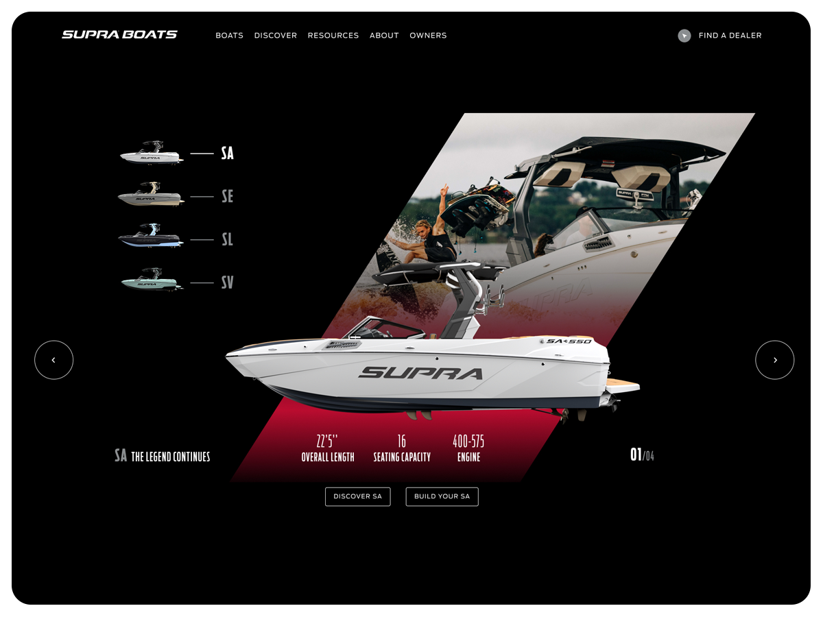 The Supra Boats website blends bold performance visuals with refined luxury details, creating a digital experience that feels as premium, powerful, and meticulously engineered as the boats themselves.